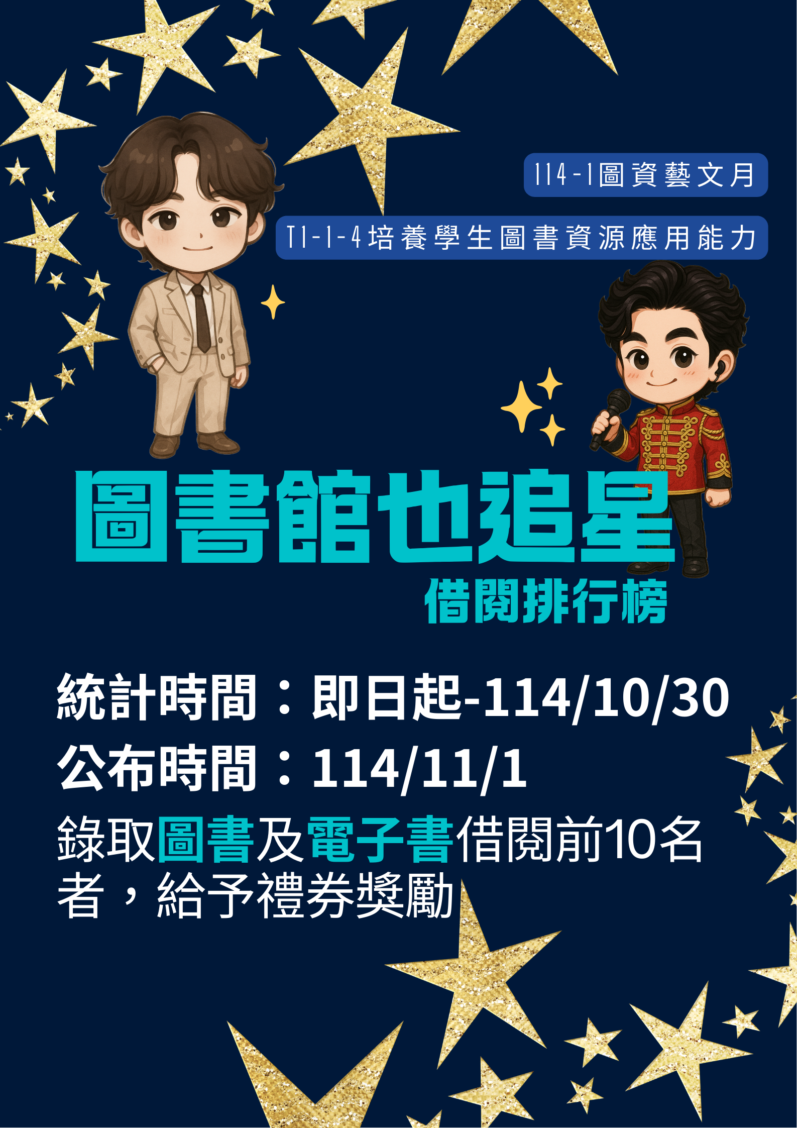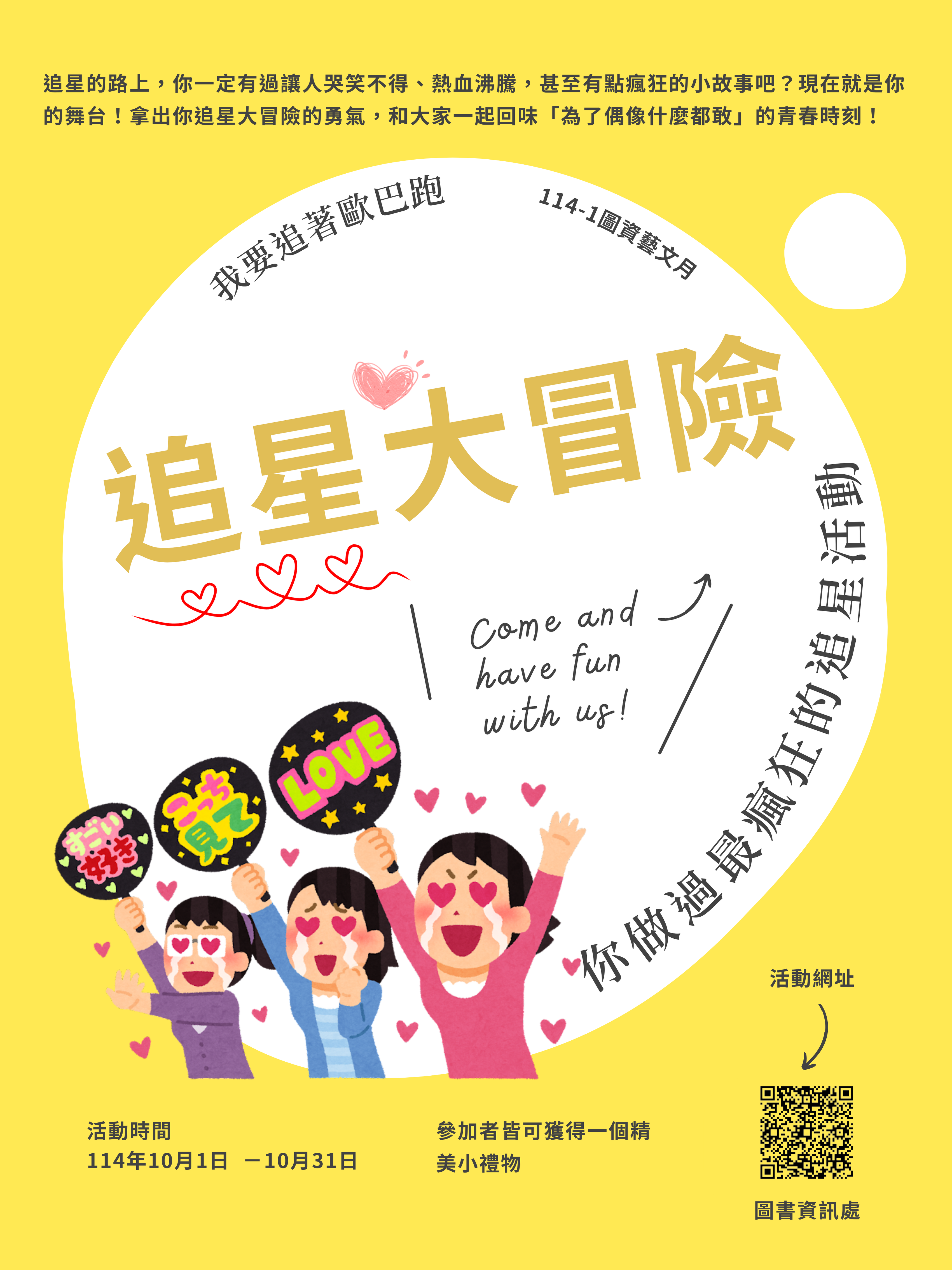 本校圖書資訊處舉辦【114學年度第1學期圖資藝文月「圖書館也追星」】系列活動,歡迎踴躍參加