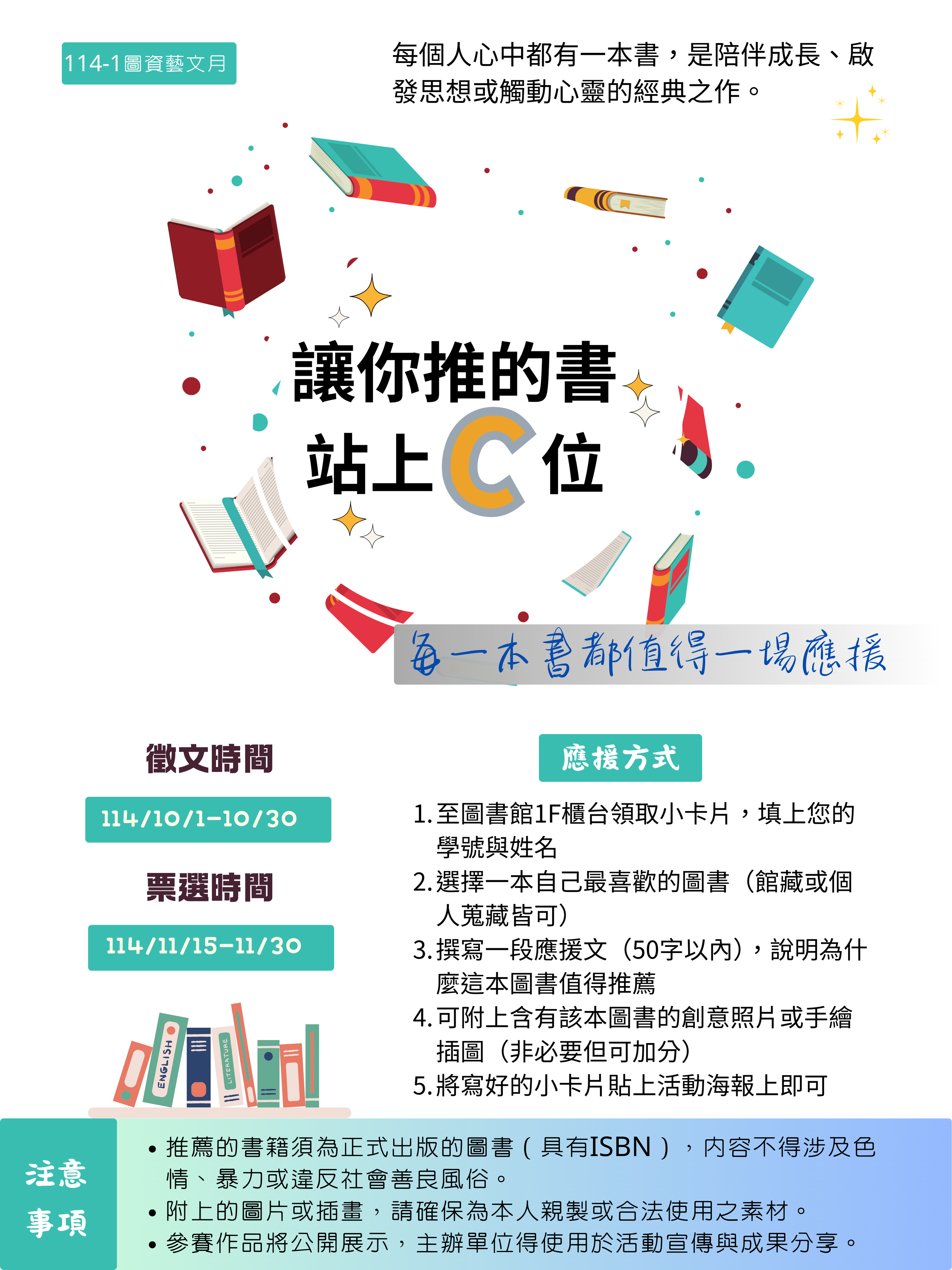 本校圖書資訊處舉辦【114學年度第1學期圖資藝文月「圖書館也追星」】 系列活動,歡迎踴躍參加。