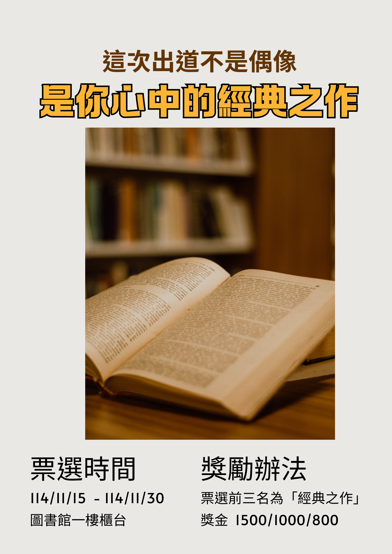 活動內容:票選「讓你推的書站上 C 位」的活動,讓每一本同學們推薦的書籍,經由票選的過程, 選出大家心目中也認同的經典作品。